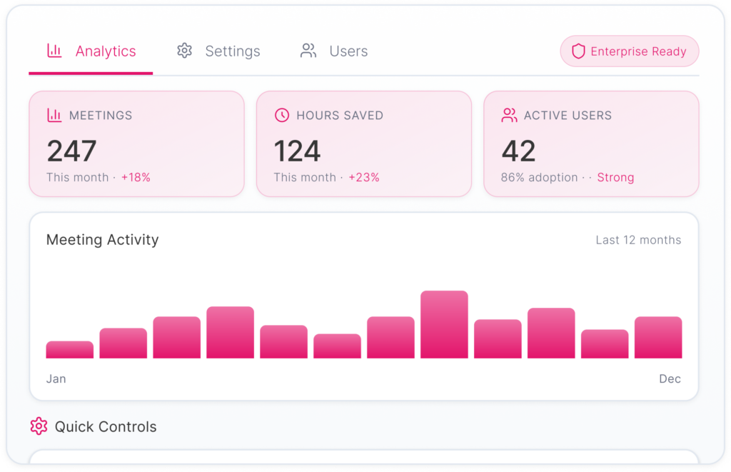 As teams scale, meeting data needs governance, not guesswork. Jamy’s admin controls and analytics dashboard give organisations the ability to manage users, control recordings, apply branding and gain insight into how meetings are actually being used.